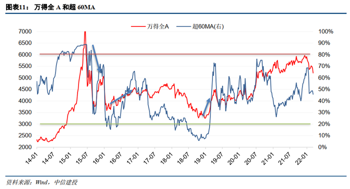 该指标表示市场上股价超过60周平均线的股票占上市公司总数比例,占比越高代表了市场越乐观的情绪。超60MA指标主要作用是预测市场反转情况。当超60MA持续过高或者持续过低,市场情绪进入极高峰或极谷底时,往往预示着行情将迎来反转。
