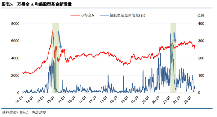 偏股型基金新发量较市场行情稍有滞后,如2015年上半年和2020年后半年的牛市,偏股型基金发行量高点略晚于股市高点。但新发量指标对行情反转有较好的预测性,比如2015年4月份起偏股基金新发量快速走高,在2015年8月4号达到顶端,当年6月、8月相继发生指数大幅下跌。另以2020年底到2021年初为例,由于2020年下半年股市行情向好,偏股基金发行量长期较高,到2021年1月中旬单日发行量超过200、300亿份,随之而来2月份市场行情有所走弱。