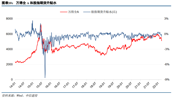 升贴水幅度对股市有一定预测能力。2015年6月上旬股指期货升贴水幅度由2.07%骤降至-0.35%,市场情绪随之转向悲观,万得全A指数由6月12号超7200点的高点一路下降到7月初的4000点。