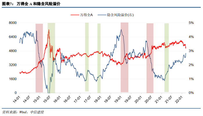 隐含风险溢价反映了股票市场相对于债券的吸引力和投资者的风险偏好,溢价上行意味着估值水平降低,股票相对于债券投资性价比上升;当隐含风险溢价处于低点,则说明市场估值水平偏高,下跌风险较高。