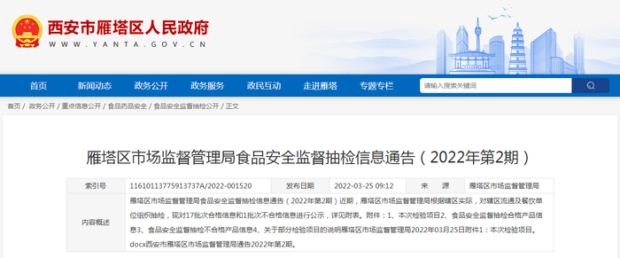 中国质量新闻网讯 近日,西安市雁塔区市场监督管理局发布食品安全监督抽检信息通告(2022年第2期)。本期对辖区流通及餐饮单位组织抽检,现对17批次合格信息和1批次不合格信息进行公示。