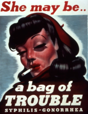 二战前后,美军中性病盛行,严重影响了军队的战斗力。美军制作了很多宣传海报,告知士兵“买春”的危险。图片来源:商业内幕