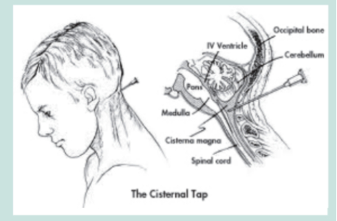 研究员利用多种手段感染实验对象。包括图中表现的小脑延髓池穿刺。根据危地马拉梅毒研究项目的主任卡特勒所说,这样做是为了研究人体血-脑脊髓液屏障的有效性。图片来源:美国总统生物伦理研究委员会2011年9月报告