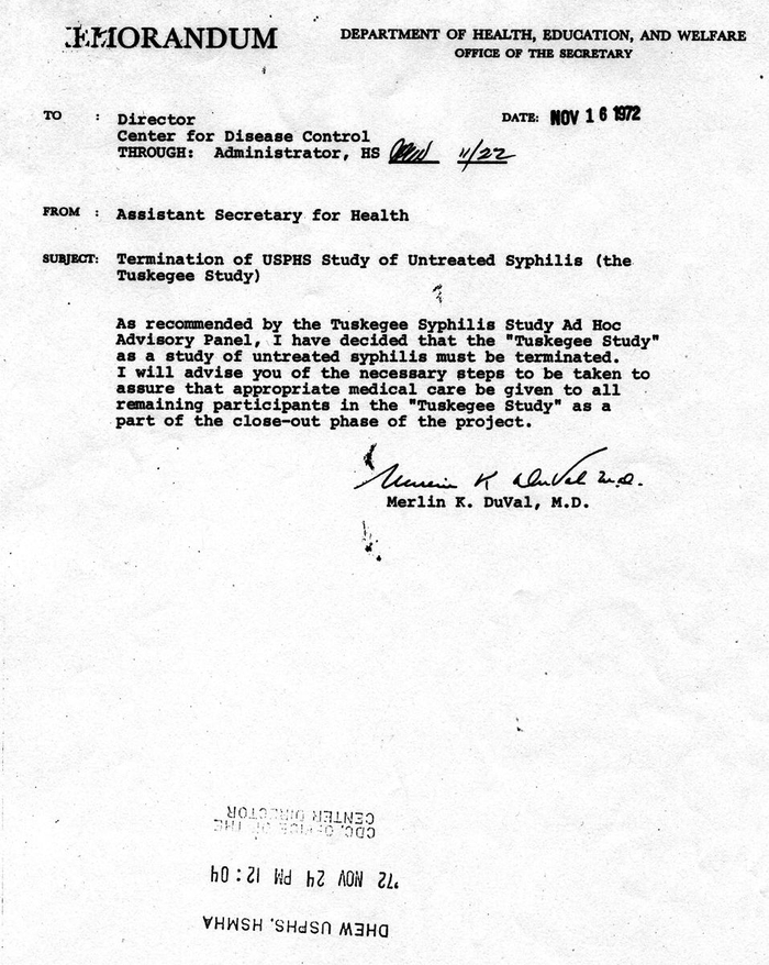 但黑人又不傻,因此质疑声还是频频出现(但没有什么作用)。为了能够达到对患者病程进行终身追踪、以及死后尸解的目的,美国卫生部认真部署了计划,绞尽脑汁、威逼利诱劝说黑人患者及其家人留下来参与。以及种种好处,包括允诺“就算人没治好死了,也会给他们一笔丧葬费”等等,并表示这是“最后一次获得特殊免费治疗的机会”。