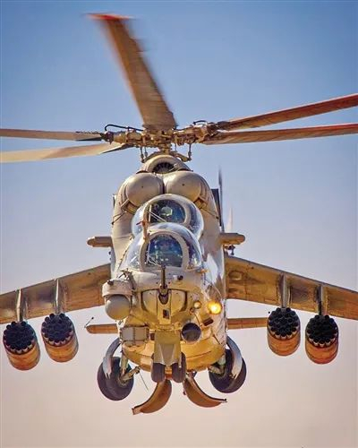米-24“雌鹿”是20世纪70年代苏联研制的一款武装加运输的多用途中型直升机。该机最大优点是火力猛、防护力强,机身两侧短翼下可挂载反坦克导弹、高爆火箭弹、温压弹、射速4000发/分的加特林机枪等武器,加上机头下方的30毫米双管机炮,足以摧毁众多地面目标。机身装甲由钛合金打造,能够抵御小口径防空武器攻击,战场生存能力较强。