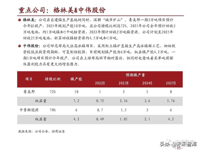 公司在自建镍生产基地的同时,深耕“城市矿山”。青美邦一期3万吨项目预计 今年Q1投产,2025年规划产能10万吨,且公司持股比例达72%。2021年公司全年预计回收3 万吨电池,约1万吨镍和5千吨钴资源,2022年预计回收2万吨镍资源。公司计划至2025年 回收25万吨电池,折算回收镍钴资源约4.5万吨和1万吨。
