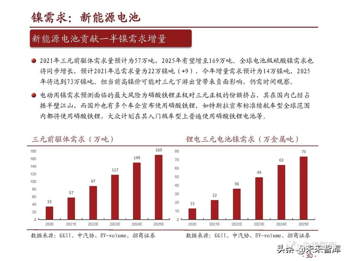 INSG数据显示,镍需求量从2000年的112.3万吨增加到2021年的277.3万吨,年均增长率为 4.4%。2022年镍需求量预计+9.8%至304.4万吨。2010年以来仅2020年负增长,当年受疫情影 响全球镍需求小幅萎缩0.9%。随后2021年镍需求强劲反弹16.3%,两年复合增长率7.4%,快 于疫情前增速,主要受新能源车的电池用镍需求拉动。伴随着新能源车快速渗透以及三元电池高镍化趋势,预计镍需求在未来几年都将保持较高增 速,有望实现年均近10%增长,展望2025和2030年全球镍需求有望达到约370万吨和460万吨。
