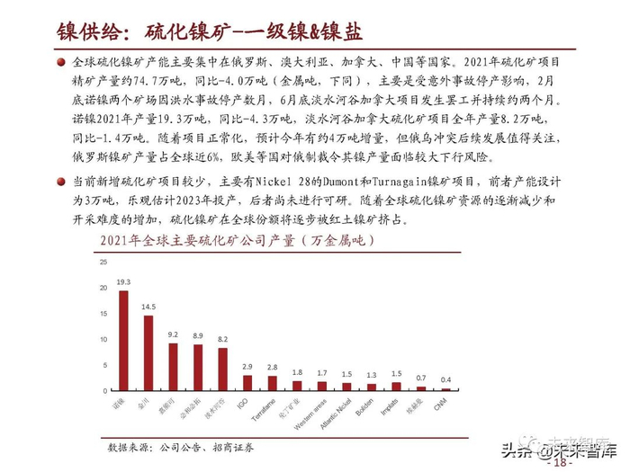 全球硫化镍矿产能主要集中在俄罗斯、澳大利亚、加拿大、中国等国家。2021年硫化矿项目 精矿产量约74.7万吨,同比-4.0万吨(金属吨,下同),主要是受意外事故停产影响,2月 底诺镍两个矿场因洪水事故停产数月,6月底淡水河谷加拿大项目发生罢工并持续约两个月。诺镍2021年产量19.3万吨,同比-4.3万吨,淡水河谷加拿大硫化矿项目全年产量8.2万吨, 同比-1.4万吨。随着项目正常化,预计今年有约4万吨增量,但俄乌冲突后续发展值得关注, 俄罗斯镍矿产量占全球近6%,欧美等国对俄制裁令其镍产量面临较大下行风险。