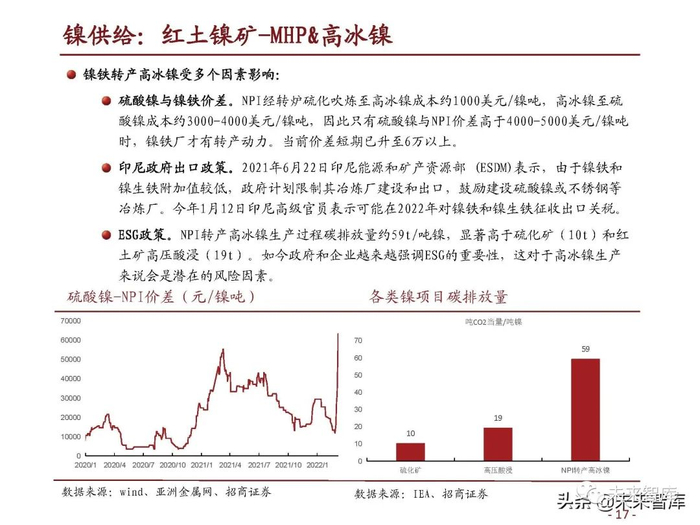 硫酸镍与镍铁价差将影响NPI与高冰镍之间的产能分配。青山高冰镍项目为NPI转产而来,公 司去年曾表示2021/22/23年预计生产镍当量60/85/110万吨,其中高冰镍和镍铁的产量将根 据市场需求和价格变化情况切换调整,目前市场预计青山2022年高冰镍产量10万吨。