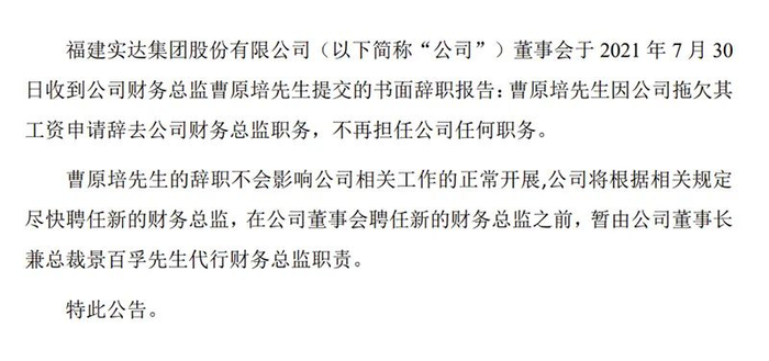 2021年7月30日,*ST实达前任财务总监曹原培以“公司拖欠其工资”为由,申请辞去*ST实达财务总监职务,此后不担任公司任何职务。