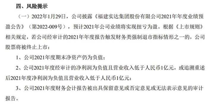 在异动公告中,公司也重点提示了仍可能触发财务类强制退市指标的有关情形。公司因涉嫌信息披露违法违规,目前处于被证监会立案调查中。如公司因立案调查事项被中国证监会予以行政处罚,且依据行政处罚决定认定的事实,触及《上市规则》规定的重大违法强制退市情形的,公司股票也将面临重大违法强制退市的风险。