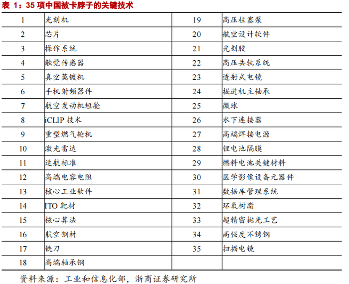 当前中国许多产业依然存在“缺芯”“少核”“弱基”的问题,究其原因在于产业基础能力薄弱。2018年《科技日报》在“亟待攻克的核心技术”的系列报道中,列举了35项“卡脖子”技术(见表1)。关键技术和核心零部件高度依赖进口,关键零部件、关键材料和关键元器件等的自给率仅为三分之一。高端数控机床、芯片、光刻机、高端传感器等,存在卡脖子的问题。工信部对中国30多家大型企业130多种关键基础材料的调研结果显示,32%的关键材料仍为空白,52%的关键材料依赖进口,大部分计算机和服务器的95%高端专用芯片、70%以上智能终端处理器以及绝大部分存储芯片依赖从外国进口。