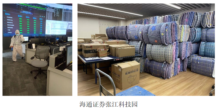 据国海证券介绍,公司员工主要通过远程会议系统、线上办公系统等进行办公。投资交易、结算托管、信息技术等重点岗位人员保持驻守公司以确保业务稳定运营。为保障每位入场员工的身体健康与办公安全,公司为驻场员工每人购置配备充足的防疫物资。考虑到多位同事入场工作后将在公司内留宿多日,还为员工配备了折叠床、睡袋、毛毯、洗漱包等生活用品,并确保一日三餐营养、卫生。