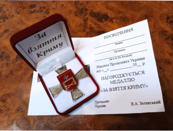 事实上,这些被称作为“占领克里米亚”特制的勋章和证书上存在多处疑点。首先,乌克兰官方(如乌克兰总统办公室)文件在提及克里米亚地区时,通常会将此地称作克里米亚自治共和国(Автономна Республіка Крим),或“AP Крим”。而网传图片中展示的盛放荣誉勋章的盒子内部及勋章下的荣誉证书上记载的该勋章名称为“За взяття Криму”, 其对于克里米亚地区的乌克兰语称呼与乌官方惯例不符。