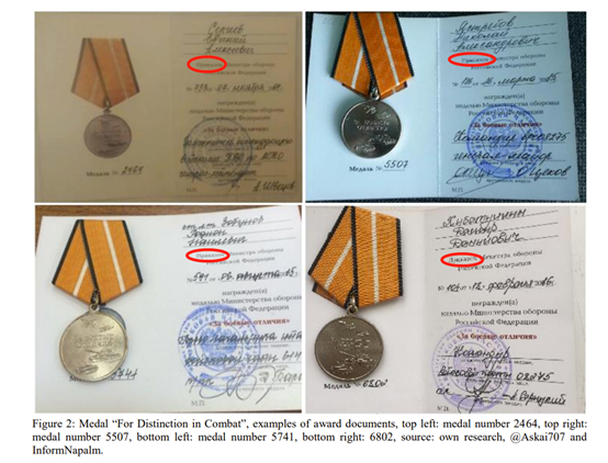 俄罗斯“战功奖章”(Medal for Distinction in Combat)及配套证书。证书上使用了“Приказом”(红圈部分)一词。