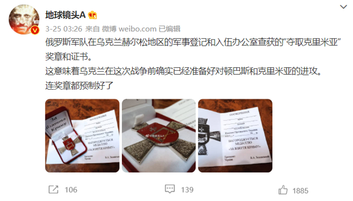近日,一则在微博平台广泛传播的消息称,俄军在乌克兰南部赫尔松地区的一间军队办公室中发现了为“占领克里米亚”而准备的勋章和证书,或意味着乌克兰在此次俄乌冲突爆发前就已准备好进攻克里米亚。随文的配图展示了该“勋章”与“证书”的制式。