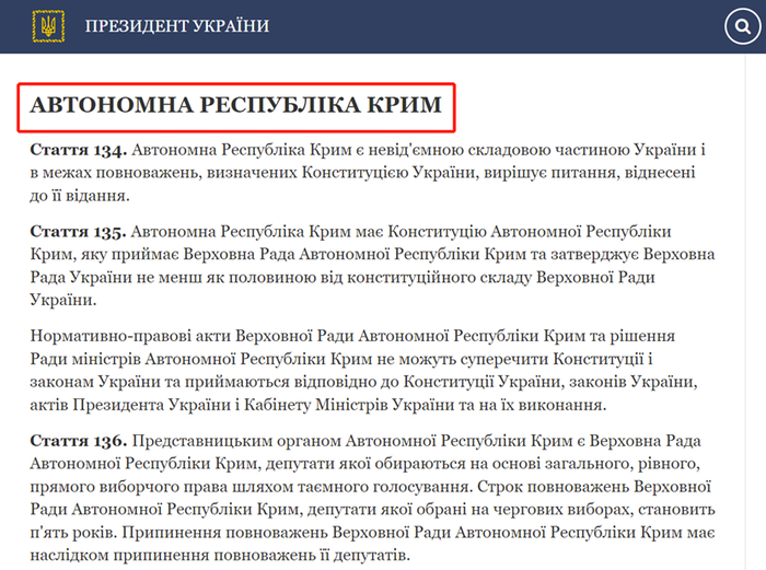 乌克兰总统府官网发布文件中称克里米亚地区为“克里米亚自治共和国(Автономна Республіка Крим)”。