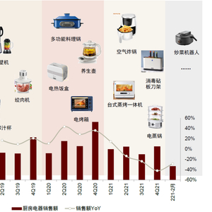 厨房小家电销售与居家需求关联较强。淘数据显示,2020年/2021年/2022年1-2月厨房小家电零售额同比分别为+31%/-22%/-29%,需求大幅波动。主要原因在于:2020年疫情期间居家需求高增,带动厨小电销售迅速提升;2021年居家需求被透支、线下消费恢复,部分2020年购入的长尾产品闲置,高基数下厨小电零售额回落。