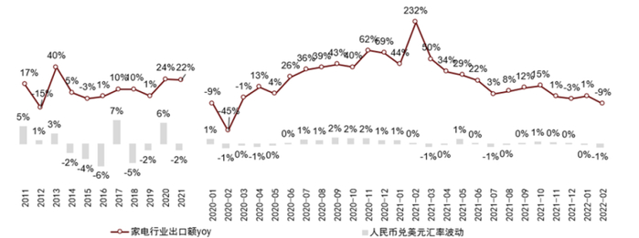 家电行业出口额自2Q20以来高速增长,主要受益于中国品牌全球份额快速提升,以及海外疫情得到控制后需求逐渐复苏。而进入3Q21后,高基数压力显现,同时受到海外疫情补贴结束、美国高通胀压力的影响,出口增速有所回落。海关统计,中国家电出口额(美元)3Q21/4Q21/2022年1-2月同比分别+8%、+4%、-4%。