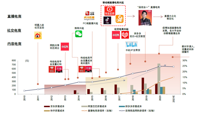 ► 2018-2021年,更多线上平台开始商业化,流量成本持续攀升。小红书开始规范笔记导流商品链接,B站UP主带货视频层出不穷,线上平台开始逐步寻求商业化的合适路径。传统电商中心化分发带来高额流量费用,品牌营销的投入产出效率在逐渐降低,而疫情加速了直播带货的发展,抖音、快手等直播电商已成为一个重要渠道,艾瑞咨询数据显示直播电商用户渗透率已从2018年1.5%大幅提升至2020年11.2%水平。随着行业新进入者不断涌入,线上流量风口快速变化,传统电商和新型电商获客成本均快速攀升。