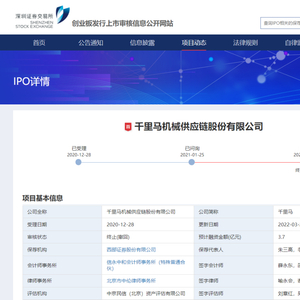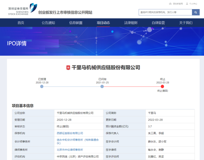 2022年3月22日,千里马机械供应链股份有限公司申请撤回发行上市申请文件。根据《深圳证券交易所创业板股票发行上市审核规则》第六十七条,本所决定终止对其首次公开发行股票并在创业板上市的审核。