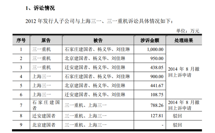 2012 年 6 月,发行人向证监会提交了 IPO 申请材料。2012 年 7 月,发行人收购广西华沃工程机械有限公司(以下简称“广西华沃”)为控股子公司,广西华沃为临工品牌广西地区的代理商。2012 年 8 月,三一重机、上海三一以石家庄建国者等经营竞争关系品牌产品等为由要求终止代理合作关系,当月对石家庄建国者、北京建国者、迁安建国者、杨义华、刘佳琳提起诉讼,请求上述 3家建国者清偿欠款,并要求杨义华、刘佳琳承担连带清偿责任。至此,发行人与三一重机在北京、天津、河北地区中止合作。