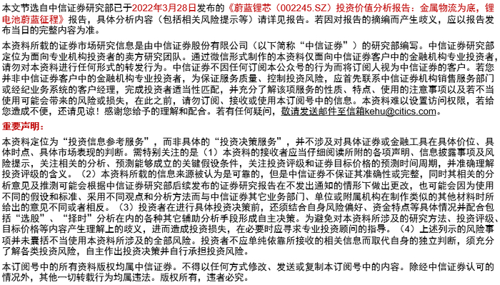 公司以金属物流起家,重点发力锂电池业务,精准切入电动工具电池细分赛道,产品参数行业领先。在电动工具无绳化趋势下,对锂电池的需求有望持续增长,国产替代趋势明显。公司是国内首家量产高镍圆柱NCA电池的厂商,研发投入不断提升,产品性能对标国际行业龙头,进入BOSCH、史丹利百得、TTI、Makita、Metabo、EINHELL等国际知名品牌供应链,同时具有成本优势,盈利能力可观。公司加速扩产,有望迎来量利齐升的高速成长。我们预计公司2022/2023/2024年净利润分别为9.97/14.39/21.53亿元。