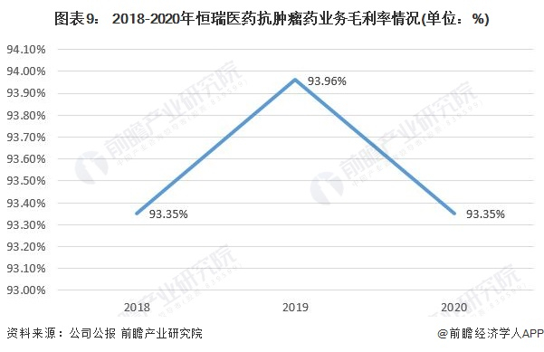 2018-2020年,恒瑞医药抗肿瘤药业务收入呈上升趋势,由42.49%上升至55.29%。 2020年,恒瑞医药抗肿瘤药业务收入为152.68亿元,毛利率为93.35%。