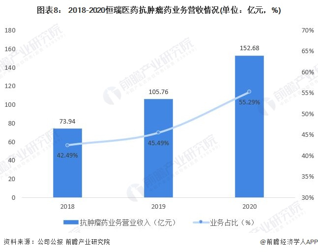 2020年,恒瑞医药抗肿瘤药业务实现营业收入152.68亿元,同比上涨44.37%,其营收占比最高,为55.29%。