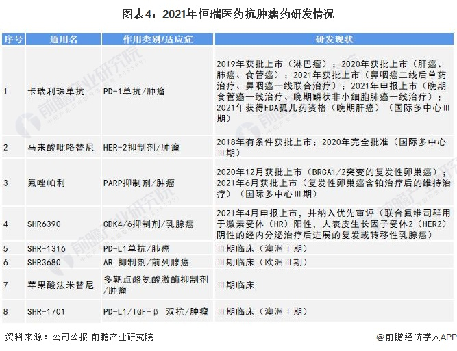 2021年,公司在国内外共开展240多个临床项目,其中包括国际多中心临床23个。2021年上半年,恒瑞医药取得创新药制剂生产批件5个、仿制药制剂生产批件9个,取得药品临床批件41个,取得10个品种的一致性评价批件,完成2种产品的一致性评价申报工作。公司抗肿瘤药重要产品研发情况如下图所示: