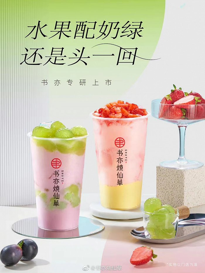 以及去年秋天,书亦还将奶茶与水果结合,推出小丑鸭葡萄奶绿、小丑鸭草莓奶绿。