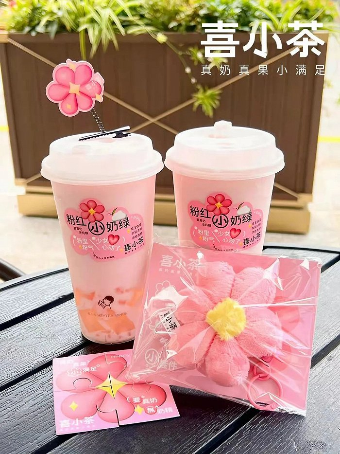 再往前,喜小茶推出的3.8节新品,起名“粉红小奶绿”,用茉莉花香翠玉茶底,加入胶原动感波波、桂花冻,再用火龙果调色,呈现的也是清新粉红的感觉。