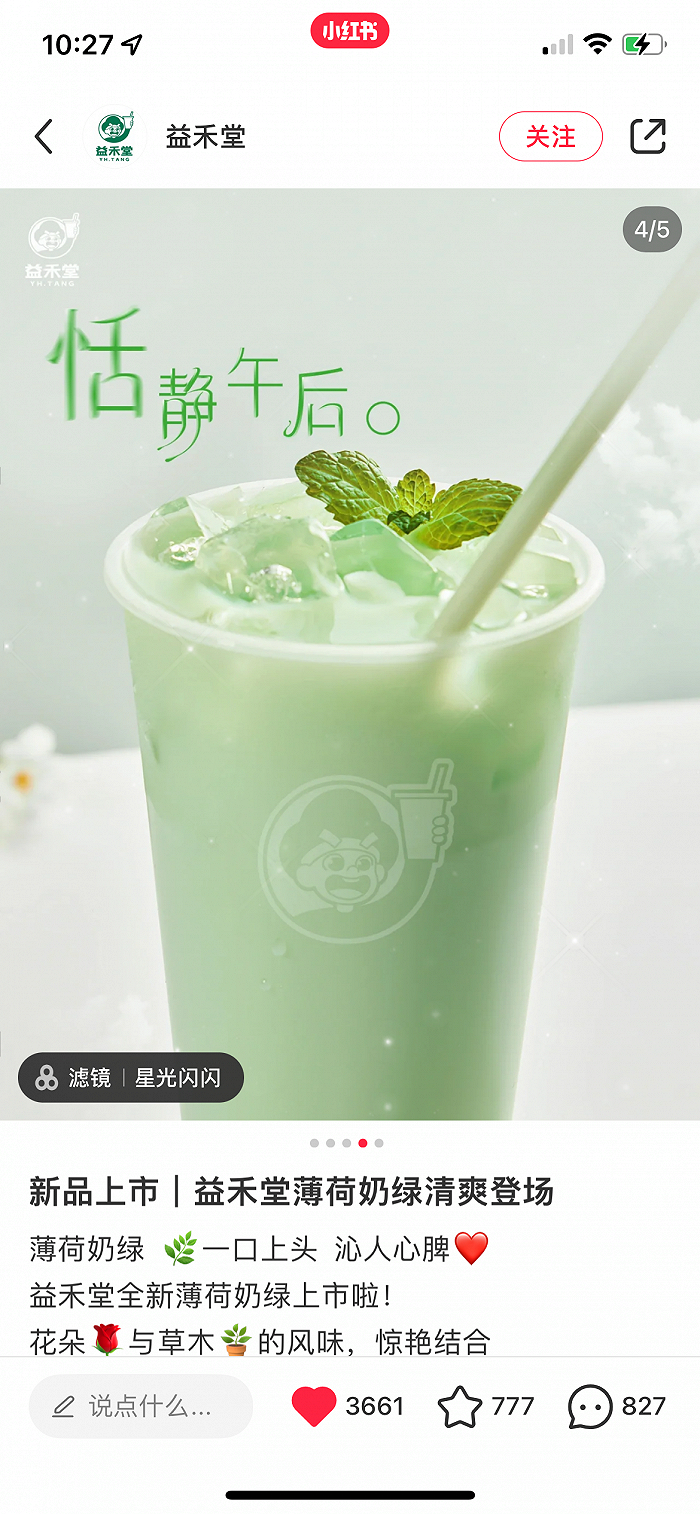 上周五,益禾堂推出薄荷奶绿,将茉莉花香和薄荷的清香融合,产品偏绿的颜色,满眼清新,官方介绍也是要打造“沁人心脾的清爽香醇”。