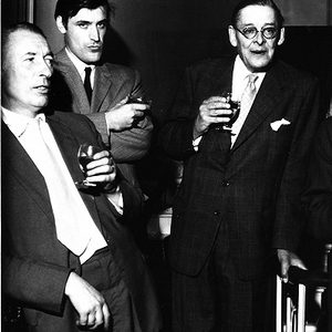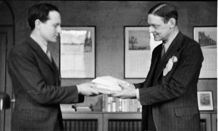 初级编辑艾伦·普林格尔(右)将《芬尼根守灵夜》第一部校样交给T.S.艾略特(左)