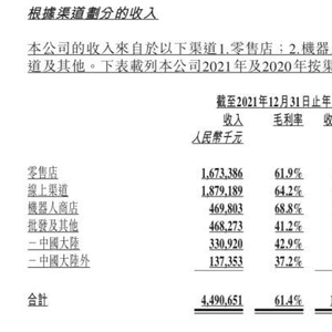 财报显示,根据渠道划分的收入,其中2021年中国大陆以外的批发及其他收入从2020年的7420万元,已增加到2021年的1.374亿元,同比增长了85.2%,主要由于海外市场的扩张,以及在海外不同国家的品牌推广。