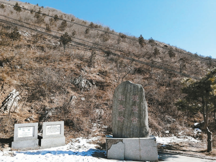 镌刻着“北齐岭观景台”字样的石头旁边,有两块低矮的白底绿字的方形石碑,一块上面的文字是“全国重点文物保护单位——长城——明前长城流村南段”。另一块上面的文字以《明前长城流村南段》为题,对这段古长城进行了简要介绍。内容如下:“位于流村镇域内,呈南北走向,沿山脊而建,南端接门头沟境,北端接明长城流村镇段。其西侧分别有禾子涧村、老峪沟村和马刨泉村,其东侧有溜石港村。此段长城大约修筑于北齐时期(550—577),全长23.5千米,其中三分之二有墙体遗存,三分之一为山险。因其建筑年代较早,墙体遗迹呈垄状依附在山脊上,皆为就近毛石堆砌。此点名北齐岭,禾子涧路从这里经过并与这道长城形成十字交叉,在山口两侧可见明显的墙体遗存分别向两边延伸,是北齐长城较长的一段遗存。”
