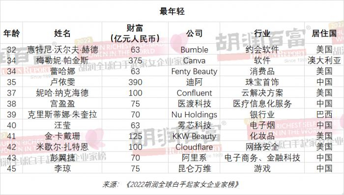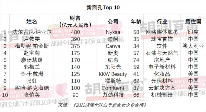 19位新面孔,比去年的43位有所下降。其中12位来自中国。排名最靠前的是印度化妆品零售商Nykaa 58岁的法尔古尼·纳亚尔,财富480亿元排名第十;其次是来自中国的DR钻戒35岁的卢依雯,财富390亿元排名前二十;以及澳大利亚在线平面设计软件Canva 34岁的梅勒妮·帕金斯,财富375亿元排名前二十。