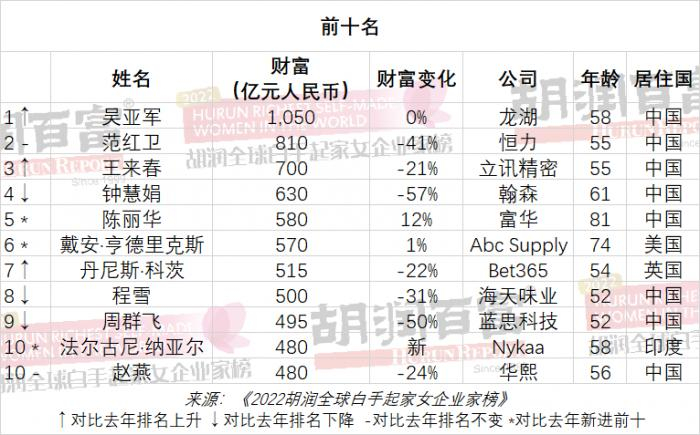 住北京的龙湖地产58岁吴亚军以1,050亿元的财富十几年来第四次成为全球最成功的女企业家;