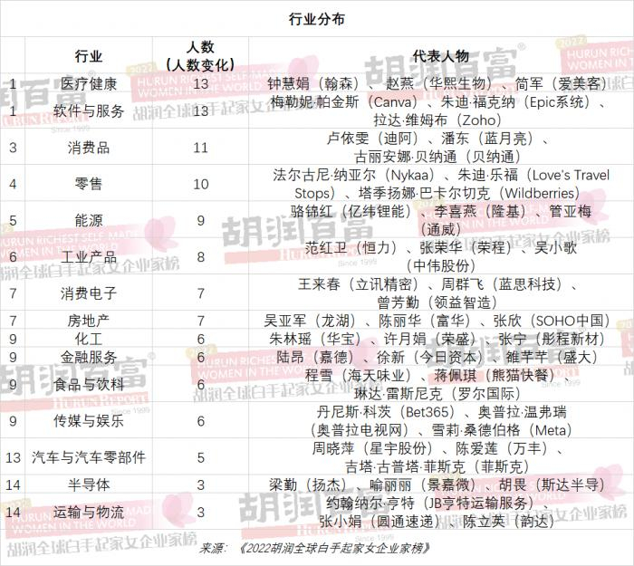医疗健康和软件与服务是主要财富来源,各有13位;其次是消费品、零售和能源。