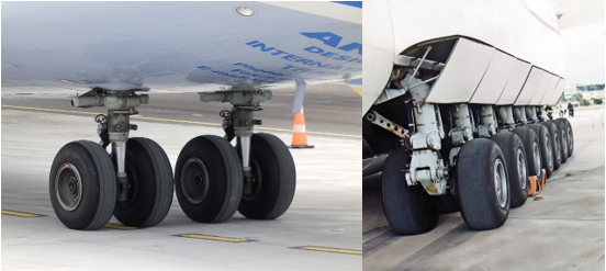 飞机起落架部分,安-225前起落架是由两对复轮一共4个轮胎组成,而主起落架部分则是前后七组复轮左右共两排,总共有28个轮胎,其中前轮和两侧七组复轮的后三排具有转向作用以提升飞机在地面滑行时的机动性,使飞机能够在60米宽的跑道内转弯。同时为了方便装卸货物,安-225的前起落架设计为可“下跪”结构。