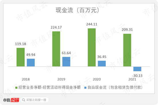 捞王一直以来在财务上都很保守。2018-2020年,包含租赁负债付款的自由现金流始终为正数,但是去年转负,净流出3000万。