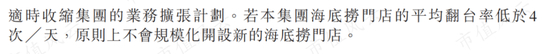 海底捞去年11月表示,如果平均翻台率低于4次/天,原则上不会规模化开设新店。