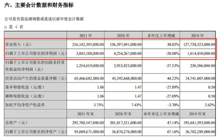 3月30日晚间,比亚迪(002594)披露了2021年年报。2021年,公司实现营业收入2161亿元,同比增长38%;实现归属于上市公司股东的净利润30.45亿元,同比下降28%。