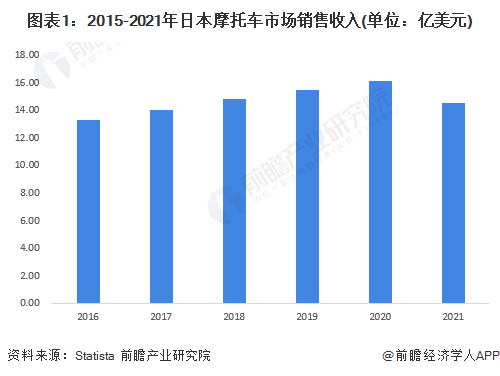 日本是全球摩托车出口大国,但其本土摩托车市场份额相对较小,在20亿美元以内。2015年到2020年,日本摩托车市场持续增长,2020年日本摩托车市场规模更是达到16.1亿美元,较2019年增长4.14%。2021年受疫情和缺芯等影响,日本摩托车市场估计有所回落,销售收入约14.5亿美元。