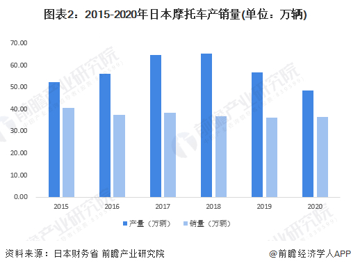从产销量来看,2015年到2018年日本摩托车产量呈增长趋势,2018年日本摩托车产量达65.17万辆,为近几年最高值,随后两年受出口需求减少和疫情等因素有所下降;而日本摩托车销量则呈现小幅波动下降的趋势,2020年日本摩托车销量约36.59万辆,较2015年减少了近10%。