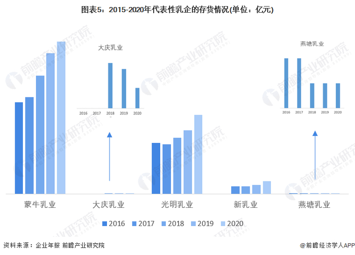 2015-2020年,蒙牛乳业、光明乳业和新乳业的存货呈逐年增长趋势,其中蒙牛乳业和光明乳业因其占据的市场体量较大,故其存货的数量和价值也相对较高;而大庆乳业和燕塘乳业的存货情况则呈下降态势,其中燕塘乳业在2018年调整过存货总量后维持在一定水平。