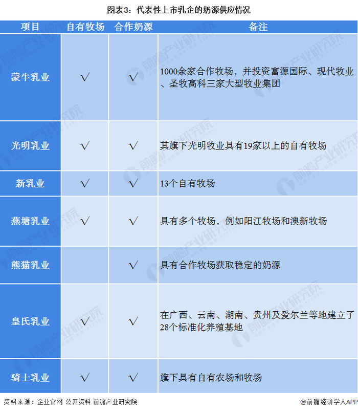 从代表性上市乳企的奶源供应情况来看,大多数的上市乳企都具有合作奶源,规模较小一点的乳企或暂未有自建牧场的规划。