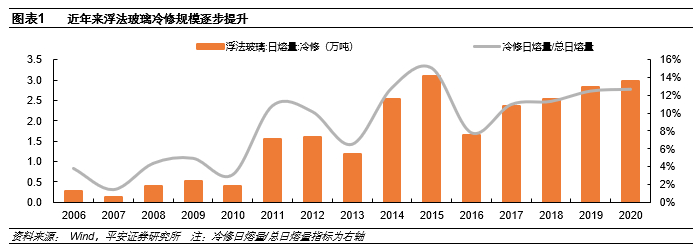 浮法玻璃生产具有连续、不间断特点,通常8-10年后需进行6个月左右冷修。浮法玻璃制造具有高温、连续、不间断的生产特性,生产期间熔融的玻璃液在锡槽中均匀摊开(锡主要作用是在玻璃还是液体时像水一样把油托起),生产一旦开始,每天24小时不停。一般而言,一条浮法玻璃生产线在窑炉点火投产后有8-10年生产周期,之后需进行停产冷修,冷修周期为6个月左右。2009-2014年玻璃生产线投产较多,按照8-10年窑龄冷修周期测算,推算2017-2024年玻璃行业将进入冷修高峰期。2016-2020年,全国浮法玻璃冷修日熔量从1.65万吨升至2.96万吨,占浮法玻璃总日熔量比重从7.8%升至12.7%。值得一提的是,优质窑炉生产周期可能超过10年,特别当玻璃价格高企,企业为追求高额利润可能延迟冷修停产。