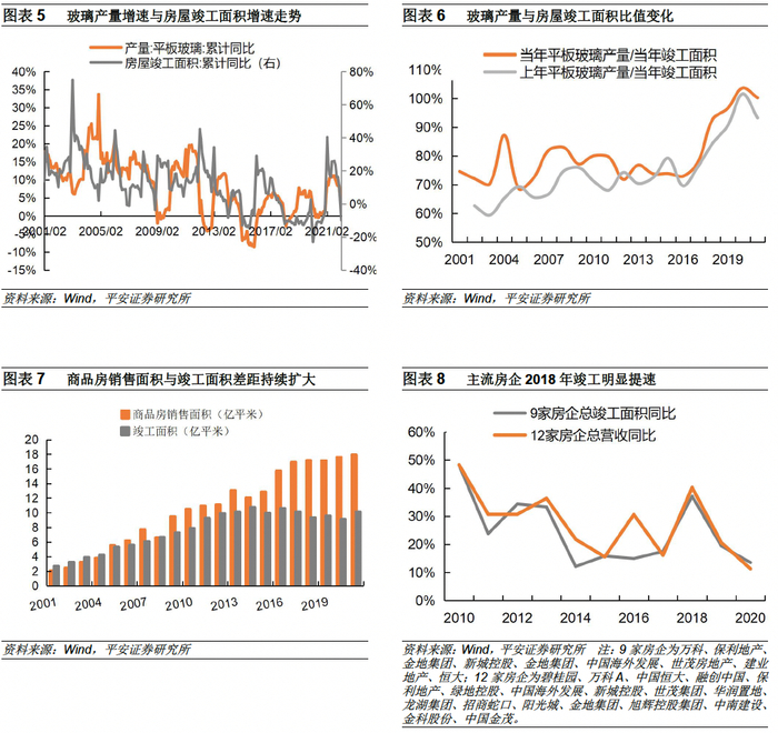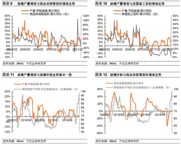 相比之下,我们认为可以将竣工与销售结合起来共同分析。因为销售作为竣工领先指标,亦可以作为玻璃需求的领先指标,实际上,房地产销售改善将提升玻璃市场预期,并通过期货市场引导玻璃价格,玻璃价格提升促使加工厂商增加备货,带动原片厂商扩大产量。实际数据表明,房地产销售面积增速明显领先于玻璃价格。当然,我们也在《地产数据深度观察系列之二:竣工高峰何时至——解惑逻辑与现实的反差》指出,由于2016 年以来资金收紧、三四线销售占比高等原因,全国房地产销售到竣工周期有所拉长,因此销售与平板玻璃量价关系亦有所滞后;同时考虑尽管统计局竣工数据存在失真可能,但只要统计口径变动不大,同比增速仍能一定程度反映竣工情况,尤其是2021H1 竣工大增,增速远高于前两年销售增速,而玻璃价格亦屡创新高,表明近两年平板玻璃需求与竣工相关性更强。