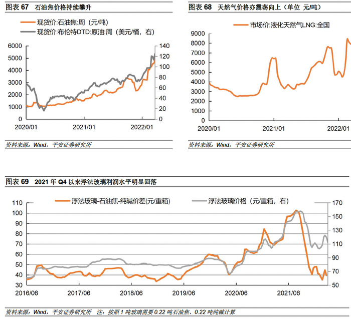 度,既而影响玻璃需求规模与价格表现。2)若后续纯碱、硅砂等原材料价格上升,天然气、石油焦、重油等燃料价格因地缘
